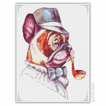 Sherlock Dog Counted Cross Stitch. Easy to Follow Embroidery Chart featuring a smart-looking bulldog detective wearing glasses and a deerstalker hat, smoking a Calabash pipe. Great handmade gift idea for a friend or make your own living room wall decor.\n\nSize: 104 x 149 stitches\nStitched on Aida 14 count: 19 x 27 cm (7.5 x 11 in)\nDMC Threads: 42 solid colours (3 blends)\nUsed stitches: full cross stitch, backstitch\nSkill level: Intermediate / Advanced\nStitch time: 50-70h\n\nCross stitch pattern in PDF, Instant Digital Download includes: 1) cover page with preview; 2) instructions, symbols key and shopping list (DMC thread colour numbers and estimates, as well as fabric options); 3) two black and white charts, with and without backstitch; 4) two colour charts, with and without backstitch; 5) single page PDF for Pattern Keeper (available on request).\n\nPlease note: This pattern is for personal use only - not for commercial use. You can't make copies of our charts to distribute (either as PDF or printed versions) but you can definitely sell your finished cross stitch work.