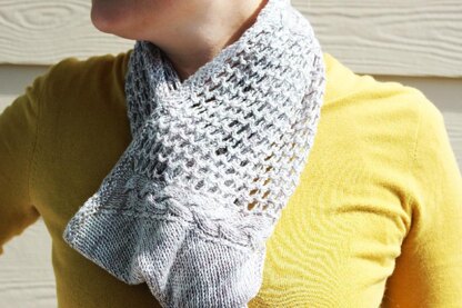 This infinity scarf is knit in the round. Panels of lace and Stockinette, bordered by cables, are given a slanted look with increases and decreases placed in the Stockinette. During blocking do your best to keep edges straight. Because of the nature of the pattern, they will not remain straight after blocking. However, this is not important as it will not be noticeable during wear.