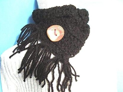 You can wear this cowl with only a button closure, with no fringe, some fringe, or all the fringe, with the beaded ties, with the beaded ties and one flower, with the entire cluster of flowers. Directions and photos included for variations.