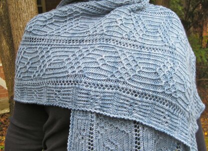 This is a pattern for a knit wrap pattern that features three distinct stitches, two of which come to us from Japan. All are interesting and fun to knit. One is a distinct faggottig lace stitch, one is a cluster (smocked) stitch and the last is a mock cable stitch. Together, the three stitches make a unique and beautiful shawl. The stitches, although they are Japanese, are easily learned by American knitters, especially those who love unique stitches. All symbols have been “translated” to the ones that most Western knitters are used to seeing.