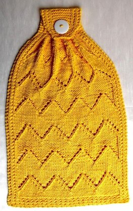 Here’s a hanging towel with some ziggity-zaggity stylish attitude! Perfect as a special shower gift. Treat yourself and knit one for your kitchen too. A good pattern for those who have mastered knits and purls and are ready to practice increasing and decreasing, and making a buttonhole.