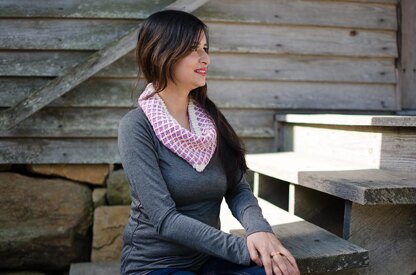 I am always on the lookout for interesting stitch patterns. I found this two-color lattice stitch on a ready-to-wear sweater in a catalog. I could not figure out the pattern from the photo so I ordered the sweater, especially so I could see the reverse side of the stitches. I haven’t decided yet if I will return the sweater, so if you see me wearing a pullover that looks a lot like this cowl, don’t tell anyone that it is store bought.
