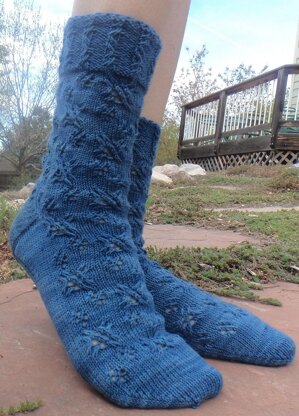 These socks have a cable ribbed cuff, Eye of Partridge heel flap, and are mirrored. The stars are formed with cables and lace.