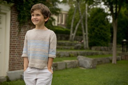 This cute boatneck is perfect for a cool summer day on the water or just out about town. Knit seamlessly from the top down, it has a classic styling that works well on boys and girls alike. The body and sleeves have bands of engineered rugby style stripes. A clean minimal neck trim and “broken rib” cuffs and hem finish off this cute kid’s pullover.