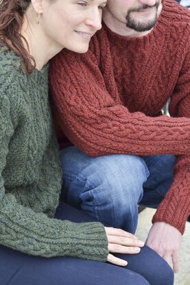 This is a saddle-shoulder pullover worked in pieces, featuring cable panels that combine organic twists and turns with the stability of vertical lines. Intended for looser 'positive ease' wear, this pattern uses a classic 'sheepy' wool, Harrisville Designs Highland. Knitters substituting yarn should look for a similar woolen yarn, or a less rustic wool if choosing a fit that is closer to the body.