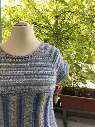 Dieses verspielte Sommershirt wird bis zur Hälfte von oben nach unten gestrickt. Danach wird quer weiter gearbeitet. Durch die unterschiedlichen Strickrichtungen und die verschiedenen Nadelgrößen ergibt sich dieses tolle Muster. Probier es gleich aus.