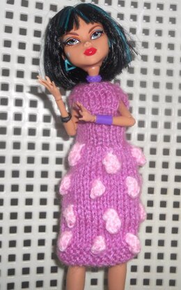 This is my first 2 patterns for Monster High Dolls . The pattern includes 2 dress variations and a purse . Both dresses knit in one so the only stitching needed are for the snaps and the seams of purse . I used 10 grm of weight 3 - D.K Light Worsted Yarn as main color for each dress and a very small amount of contrast yarn .