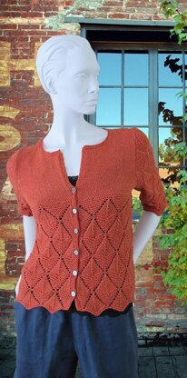 Casual yet easy to dress up, this is a perfect 3-season cardigan with 3/4-length sleeves. Originally published as a Classic Elite Yarns design, I’ve updated it in a finer yarn and added two larger sizes. The finer yarn is perfect for summer wear and the organic wool and cotton blend add just the right touch of warmth. The body is worked back and forth in one piece from the bottom up, then divided at the armholes to work the fronts and back separately. The shoulders are shaped using wrap-and-turn short-rows. The sleeves are worked in the round from the cuff up to the armhole, entirely in the lace pattern. Once the underarm stitches are bound off, continue the lace pattern back and forth to shape the cap. Narrow bands of garter stitch are added to finish off the front edges and neck.