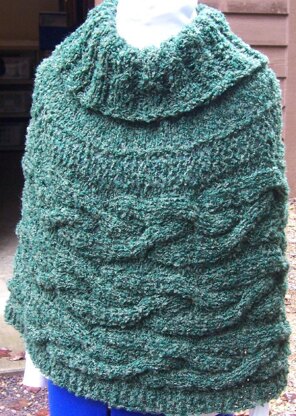 Knit both flat and in-the-round, this poncho (as shown) uses approx. 500 yards of boucle and uses charts and written directions.