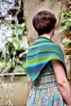 This shawl is knitted from the bottom up, using a simple two-row repeat featuring yarn over increases. The pattern makes the most of a variegated or striping wool.