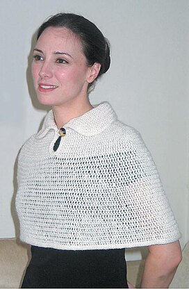 Stay warm on cool summer evenings, or curled up on the couch, in this light weight cape with a convertible collar. Created with two basic crochet stitches, single crochet and double crochet, and worked in one piece from the neck down; the collar is added later. The shoulder section and collar are worked back and forth in single crochet and the body of the cape is worked in rounds in double crochet.