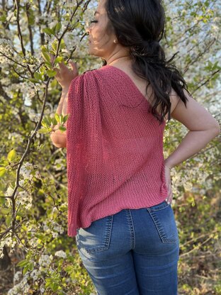 The Shoulder Shift Tank is an easy beginner knit garment or meditative project for any skill level. It can be worn loosely off one shoulder or adorned to be a one sleeve tank. Its versatile qualities allow you to go from the pool to dinner.