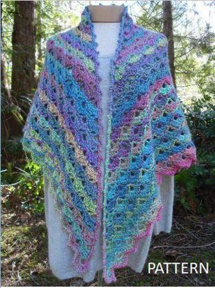 Show off your crochet skills with this gorgeous shawl. You don't have to worry about changing colors and working in loose ends to get this colorful striping effect. Yarn Bee has done the work for you by offering "Glowing" (avilable at Hobby Lobby) an aran weight yarn in wonderfully creative colorways. Starting at the neck edge and increasing two shells every row creates a fabulous triangular shaped shawl that is casual and comfortable.
