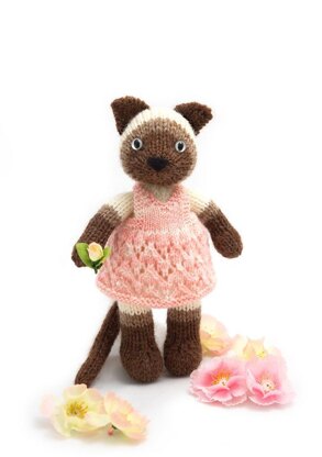 A cuddly siamese kitty toy with a sweet lacy dress. Knitting skills required include stockinette and garter stitch, increases and decreases, changing yarn colours, and yarn-over lace patterns.