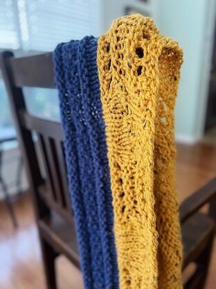 Knitted in the round with two distinct stitch patterns and in two colors. The lace pattern in the yellow color starts it off and the blue part shows off a mix of simple knit and purl stitches.