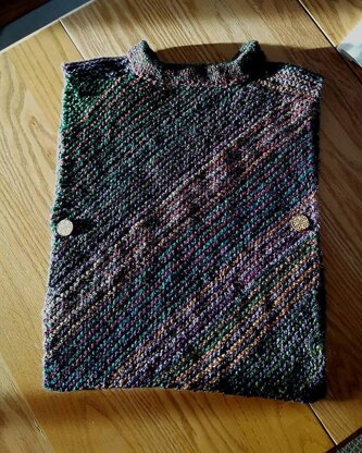 A simple little pullover to keep that little one warm on a brisk day. Construction is side to side diagonal garter stitch with a varigated or self striping yarn that creates prominent ridges on the public side, however it can also be made with a solid color and it could become a reversible garment since both sides of the knitted fabric are attractive. This would be great in your homespun wool!