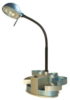 Compact table top light with accessory trays. 12V 20W halogen bulb, 240V. Ideal for sewing and craft work. Blue/Silver\n