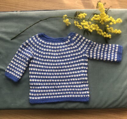 A comfy and stylish jumper for children aged from 1 month to 8 years. It uses cotton yarn, which makes it a perfect transitional garment as the weather gets warmer. With a two colour geometrical pattern and a circle yoke, this is an enjoyable make that's easy to customise.