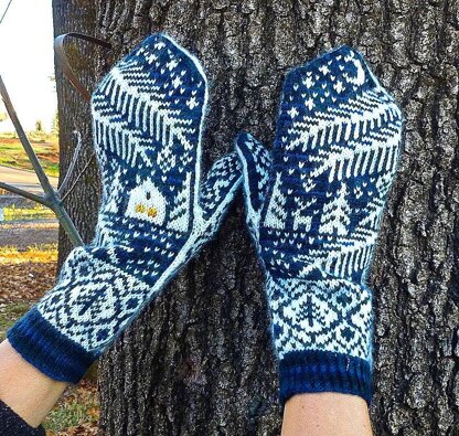 Silent Night Mittens is a stranded colorwork design featuring a winter scene. The mittens have an afterthought thumb construction. The design works equally well with dark on light or light on dark. Some sections of the design (the front part of the mittens) require you to carry yarn over longer stretches of one color; therefore, it is recommended that you utilize a float catching technique.