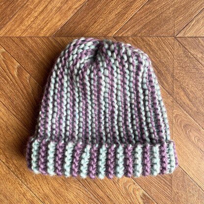 The Silke Hat is a chunky knitted beanie in two colours. It is knitted from side to side in garter stitch as a rectangular panel. The top of the hat is sewn in an X shape and then the long sides of the rectangle are sewn together. It is then worn folded over so it slouches slightly at the top of the head.