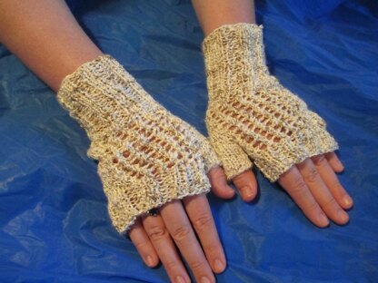 These wristlets are reversible so they can be warm in the winter or cool in the summer. They are delightfully textured, and the colors are reminiscent of cotton plants or rattlesnake skin. The pattern uses just over 1-50g ball of Bernat Chambray. If you have only one ball, simply make the cuff an inch or so shorter than indicated in the pattern.