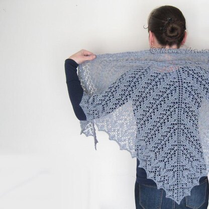 Silver Rain Shawl is a classic triangle shawl with simple but stunning lace worked in one piece from the center back to the bottom edge.