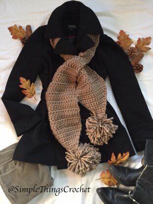 The Simba Scarf is the perfect accompaniment to the Simba Slouchy Hat. It’s made with bulky yarn, but it doesn’t feel bulky around your neck because I created a space for it to pass through itself. You don’t need to tie a giant knot to keep this scarf in place, and the pompoms just put it over the top! You’ll be warm and stylish no matter the weather in this awesome scarf. It measures 8” wide by 68” long from point to point without pompoms. You will need 4 skeins of Lion Brand Heartland yarn in Hoboken Honey.
