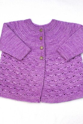 Simnia Cardigan is a traditional yoke style with a flared skirt. The patterning on the skirt is reminiscent of sea shells. It is a repeat of six stitches and is easy to memorise. The sleeve and skirt lengths may be adjusted if desired.