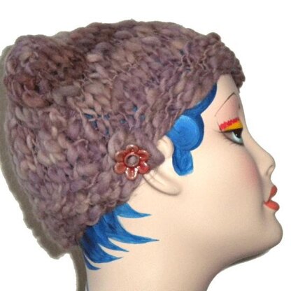 Knit side to side on straight needles this rectangle hat has no button hole, just a tab that you can sew a favorite button to, so choose a fun funky vintage or ceramic button to complete the hat! A thick and thin handspun yarn is especially nice for this hat pattern. No increasing or decreasing necessary, just cast on, knit, purl, and bind off.