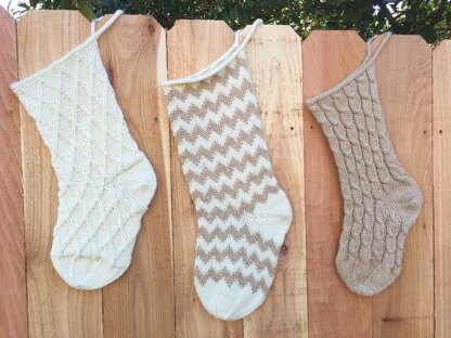 The same basic template is used for all three stockings, but with three different stitch patterns for the leg and foot. Feel free to substitute your own favorite stitch pattern, as long as it divides evenly into 72 stitches.