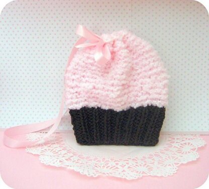 Materials: pair- size 8 straight knitting needles worsted weight yarn- for cupcake base, and worsted weight novelty or textured yarn for frosting Ribbon- 34 inches tapestry needle and this pattern