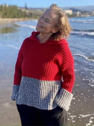 This hand-knitted pullover blends urban edge with cosy comfort. Knitted using a rib stitch for a sleek, textured look, it features a striking two-tone design. The body and hood are knitted in bold plain red, while the extended cuffs and waistline showcase a marled yarn for contrast. Designed for effortless wear, this pullover is a stylish, pull-over piece that offers warmth and a modern streetwear vibe. Perfect for a layering or making a statement on its own.