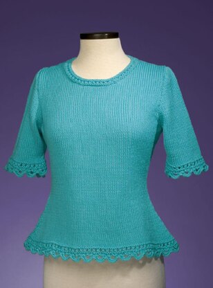 Don’t be intimidated by the beautiful scalloped edging on this pullover! It’s all knit (no crochet) and it looks far more complicated than it is; you don’t have to be a master knitter to do it! The waist is nicely shaped to bring attention to your figure and flatter your hips – be sure to use a yarn with a lot of body so the shaping will look its best.
