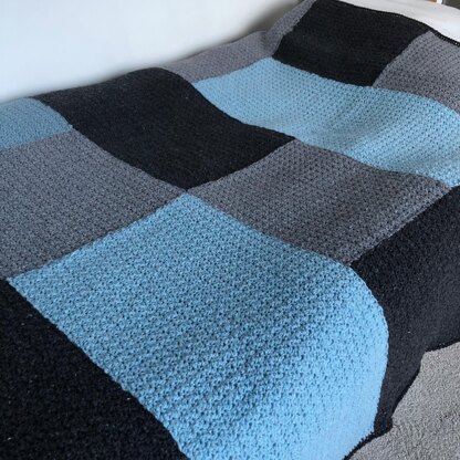 A quick and easy blanket for the cold winter evenings. Seed stitch squares and rectangles are sewn together, bordered with double crochet (UK) and edged with reverse double crochet aka crab stitch.