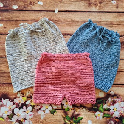 Simplicity baby shorts are crocheted in a delicious blend of cotton and acrylic, which makes them both soft against the skin and breathable. The shorts can be made with a string or elastic at the waist and there are three different edges to choose from for the trouser legs. The pattern includes sizes 6, 12 and 18 months.