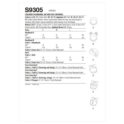Simplicity SS9305A A (S-M-L) Cozy knit headband & hat in children's sizes s-m-l & coordinating face coverings are a fun way to stay safe. Headband B & slouchy hat C have kitty & puppy ears. D is ideal for fun prints; E & F have appliqued & embroidered faces.