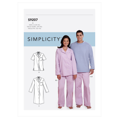 Simplicity SS9207A A (XS-S-M-L-XL) Top and nightshirt have notched collar, chest patch pocket, side seams with or without side slits. A: Short sleeves. B, C: Long sleeves. Pullover top has neckband, long sleeves and side seams with slits. Pull on, straight leg pants have waist casing with elastic and drawstrings. Sweatsuit for dog has hood, front hook & loop closure and short sleeves and pants (in sizes Small, Medium, Large). All garments have stitched hems.