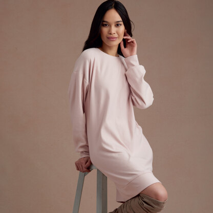 Loose-fitting sweatshirt mini dresses, with sleeve, neckline, hood, hem and kangaroo-pocket options. Suitable for double knits, fleece and sweatshirt fabrics. Can be constructed using a standard sewing machine, overlocker or serger.