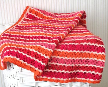 Make this sweet crochet blanket in beautiful shades of red, orange and pink for your own little one. This is also a perfect homemade birthday or baby shower gift for a little girl. The great stitch pattern looks difficult, but it is very simple and so fun to make. The blanket is made with 5 bright colors of cotton yarn using the basic crochet stitches; it’s easy enough for a beginner too.