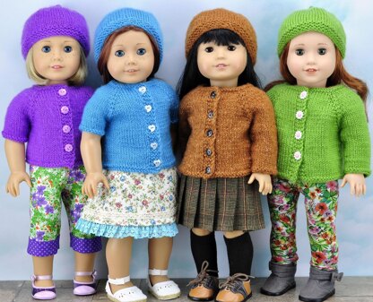 This is a PDF knitting pattern for a long-sleeved and short-sleeved simple cardigan and matching hat to fit 18 inch dolls similar to American Girl® dolls.
