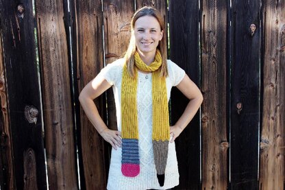 The design offers five sizes in two widths to fit everyone from babies to adults. While the barrel of the pencil is great tv-watching knitting, the ends, the five colors, and the five stitch patterns will keep your interest. This scarf has a smooth, slip-stitch edging, lots of warm squishy ribbing, and is reversible.