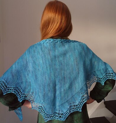 Triangular shape. The shawl is knit sideways on a background of reverse stocking stitch. A beaded lace edge is worked simultaneously as the shawl is shaped by increases to a centre point before decreasing. On the opposite (top edge) a cable is worked as the shawl grows. Beads are added as you work with wire or a tiny crochet hook. One skein (400 metres) of yarn is enough to complete this shawl.