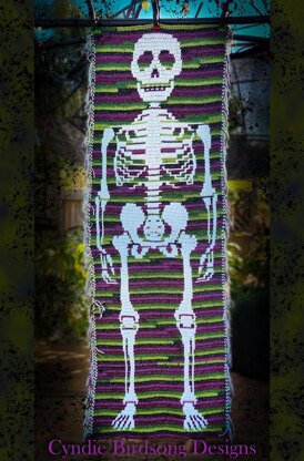 Sir Skelly Bonesington is a life-size crochet skeleton wall hanging, designed in overlay mosaic crochet with clear charts and instructions. Perfect as a spooky Halloween decoration or a year-round gothic statement piece, this pattern is suited for confident beginners and beyond. Finished size is between 5-6 feet tall when using #3 or #4 weight yard and a 4-5mm hook!