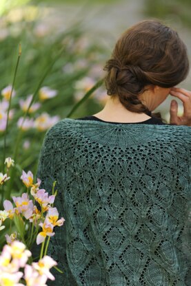 Siren Song is a densely textured, semicircular shawl with a flowing scale pattern. The design begins with a central scallop shell rib, then becomes a gradually expanding double scale textured lace with twisted rib detailing, and ends in a swooping fishnet mesh.