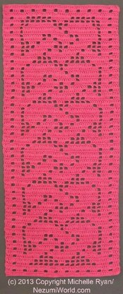 Interwoven knotwork hearts chart chart (with first row is written for both a 1 x 1 & 1 x 2 filet crochet grid). Additional information sizes using different yarns is also included. i.e. Using Crochet Cotton Thread size 10: approx. width = 4.8 inches, height = 18.8 inches, Using Worsted Weight Yarn: approx. width = 18.9 inches, height = 69.0 inches Uses American crochet terms. This makes a beautiful runner for your home.