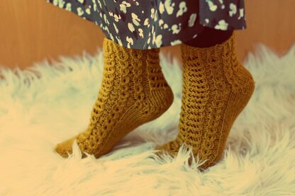 The “Skalakia Socks” are worked toe-up using an elastic lace pattern that makes them fit most adult’s sizes. The lace pattern is very easy to memorize and as it is worked with DK yarn, it is very fast to knit. It is written and charted.