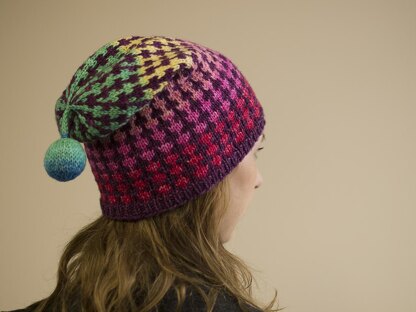 Why have a boring hat when you can have a colorful fun hat finished off with a knitted ball! Double up on warmth with the stranded design. It works up quickly in a DK weight.