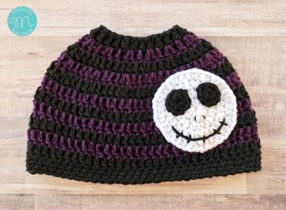 This messy bun hat features striping as well as a skeleton applique that is sewn onto the side of the hat.