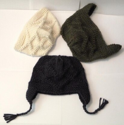 Ski-Bea is knit from the bottom up in the round. The garter stitch band and earflaps add thickness for warmth and structure while the Inverness Diamond pattern hints of argyle without going over the top (you don’t want to scare your manly man, do you?). The interlocking diamonds are maintained throughout the crown and create an unusual