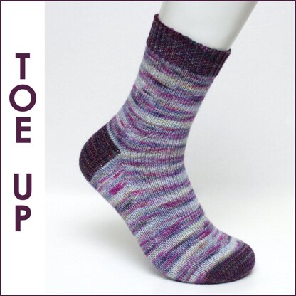 This is a toe up sock pattern, worked in one piece, from the toe up to the cuff. Casting on requires using a two needle cast-on method. The toe of the socks is knitted first, before moving onto the foot, the gusset, the heel, then the leg and finally finishing on the cuff. A stretchy cast off is used to cast off the stitches of the cuff.